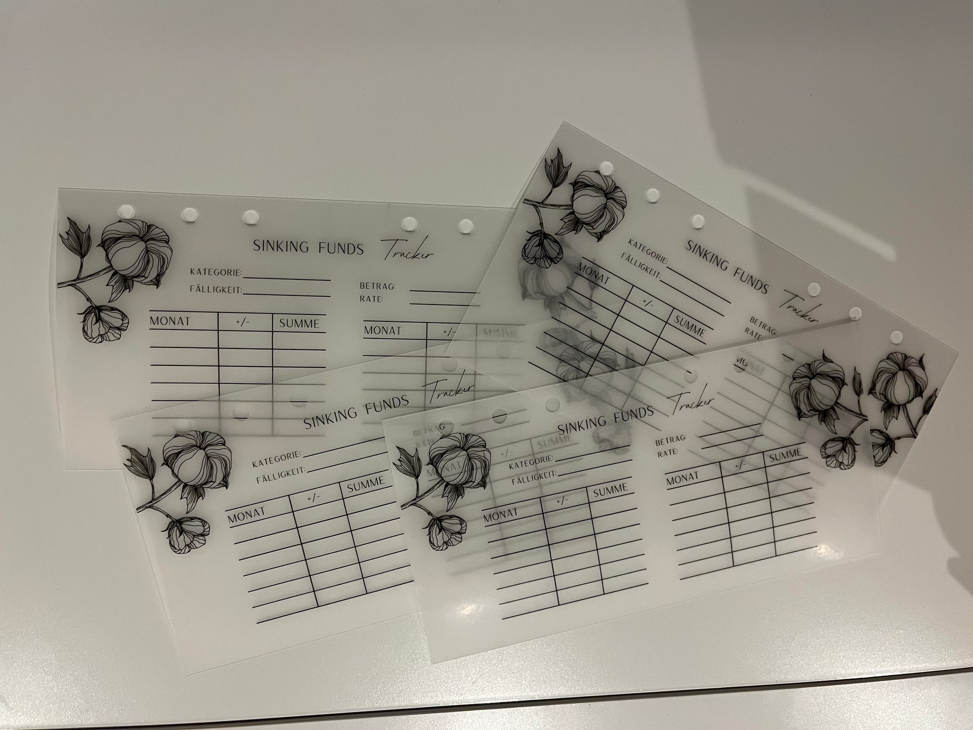 Im Paket sind 4 Sinking Funds Tracker enthalten. Passend für A6 Binder.